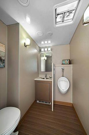 Geared toward larger events, these portable restroom trailers for rent have five stalls on the women's side, as well as two stalls and a urinal area on the men's side. Amenities include running water, flushable toilets, air conditioning, heat and radio.