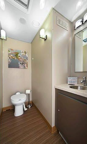 One of our portable restroom trailers for rent is a 2-Station restroom trailer. As guests enter this private, 2-Station restroom trailer they're struck by the warm, comfortable surroundings of the restroom trailer. The well-lit interior provides a pleasant atmosphere, and the heat and AC units keep the temperature comfortable all year round.